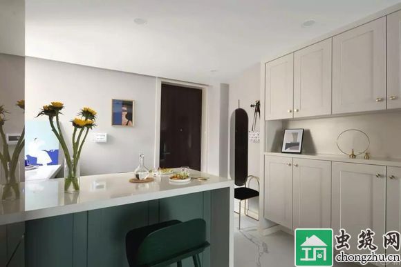 入戶右側是一個L型大吧臺,是小兩口的就餐,這里也是廚房的延伸部分。入戶左側主要是玄關功能,滿足了換鞋、收納等需求。