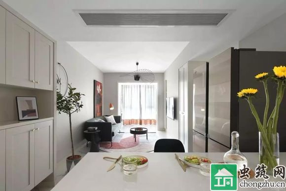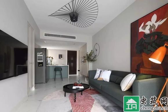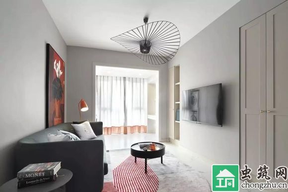 去掉傳統形式的電視柜,將電視掛于白墻之上,簡潔明了,空出更多通行的距離,空間更加寬敞自由。