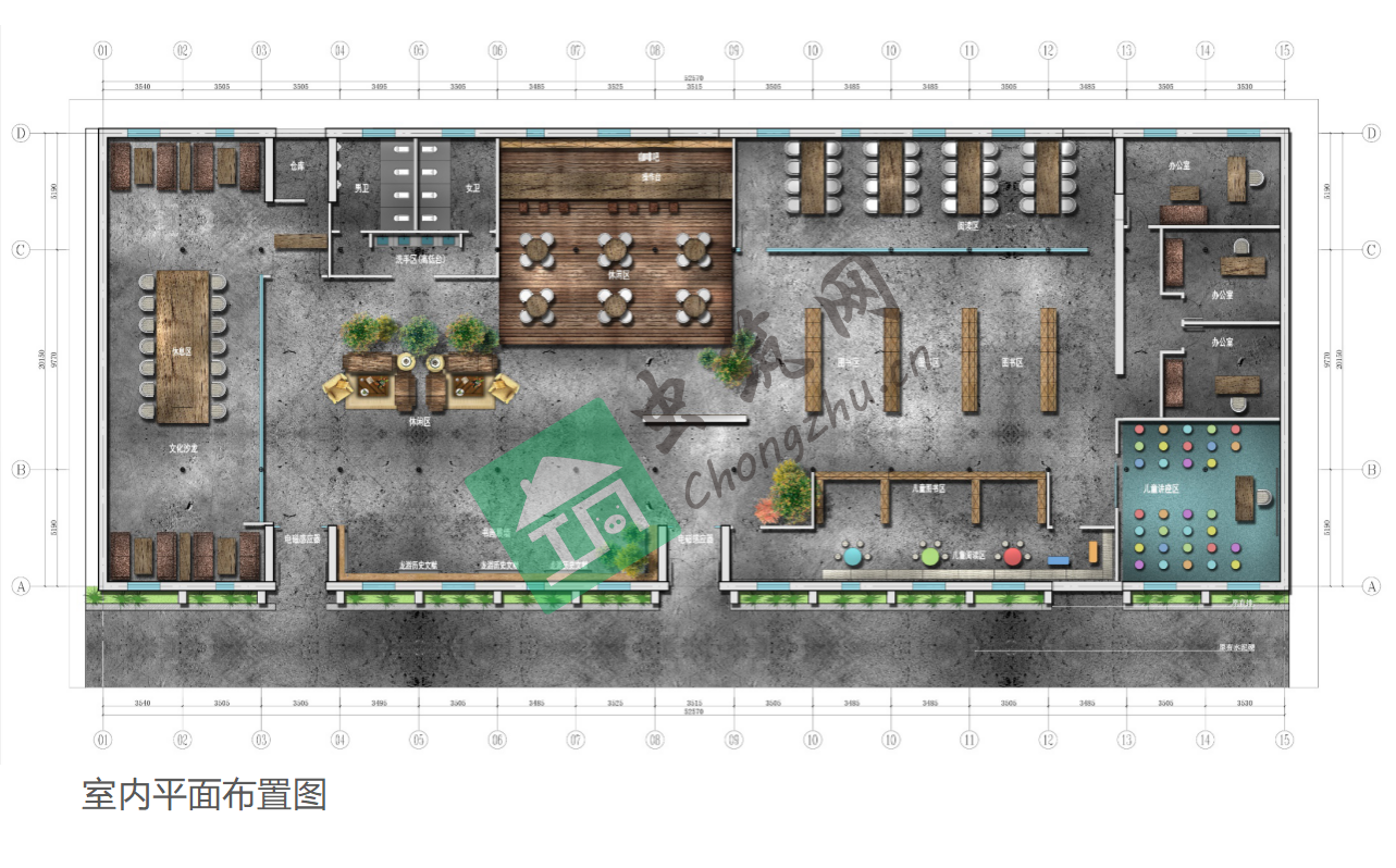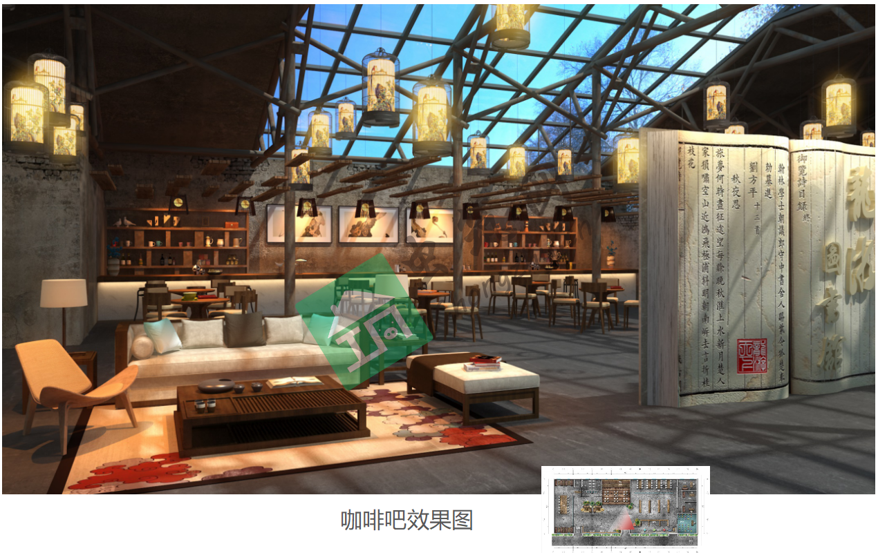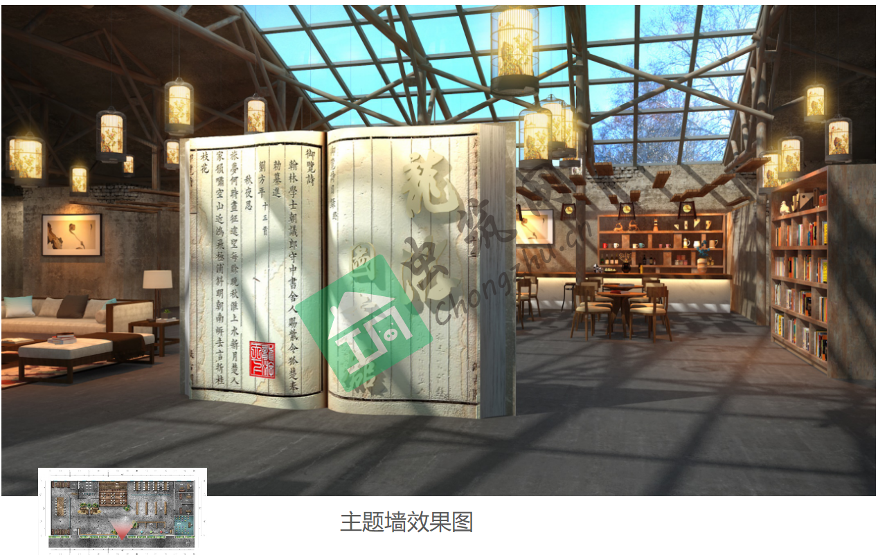 ? ? ? ? 室內區域為:圖書區、閱讀區、公共閱讀區、兒童閱讀區、兒童講座、書畫展墻(龍游歷史文獻)、咖啡吧、文化沙龍、休息區、辦公室、倉庫、衛生間。