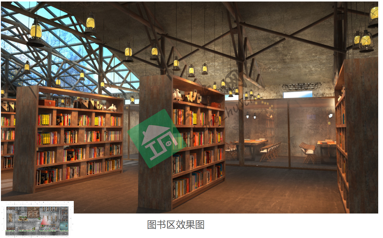 ? ? ? 書館室內總面積1030.35㎡,室內風格為工業風;同時極大保留原建筑歷史感突顯原有木結構屋頂;拆除中間部分瓦頂,改為鋼結構夾膠玻璃,保留原有建筑特色的同時極大的提高室內整體采光。增加LED燈、壁燈、臺燈、落燈,提升室內空間層次感。