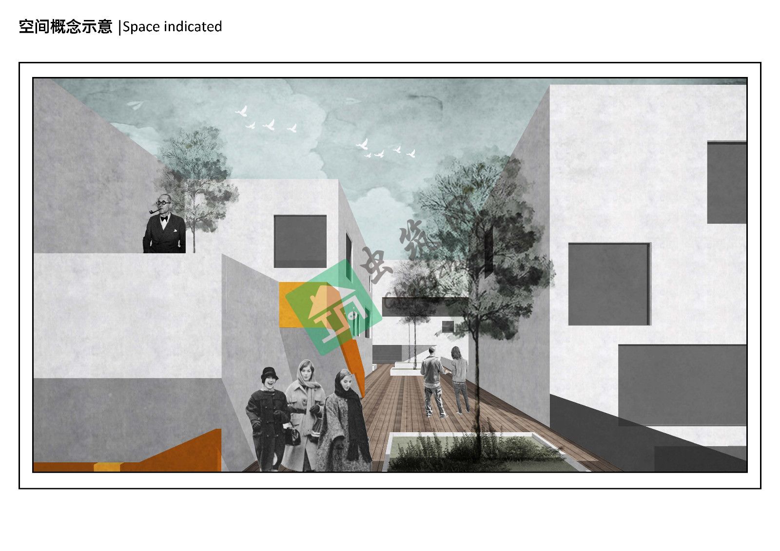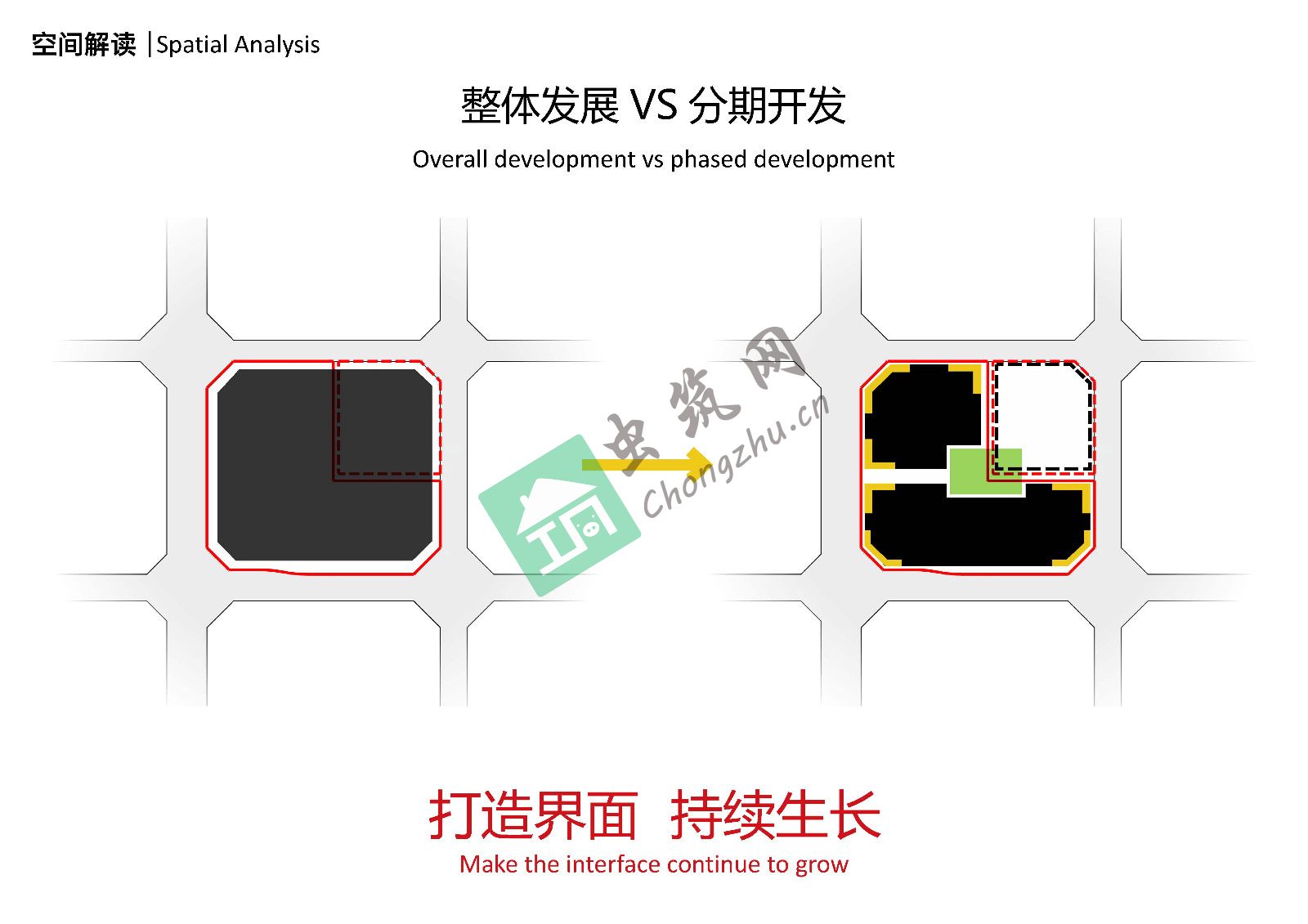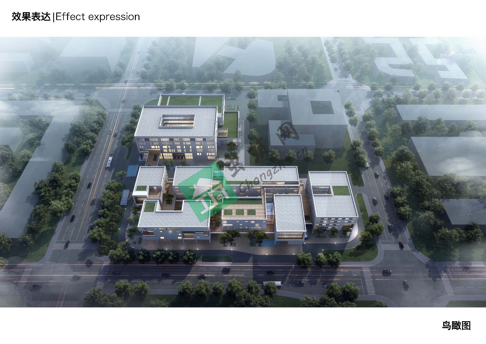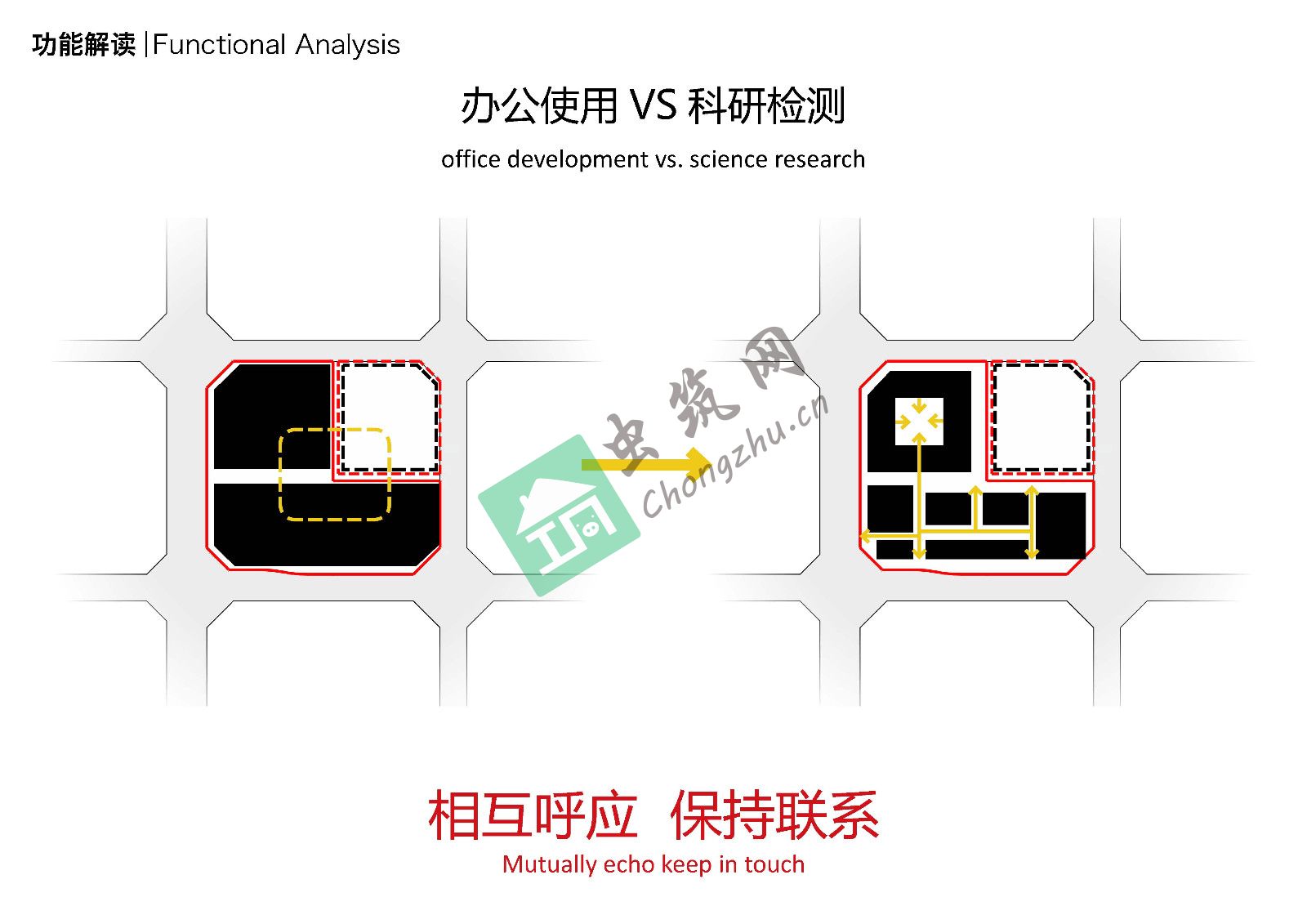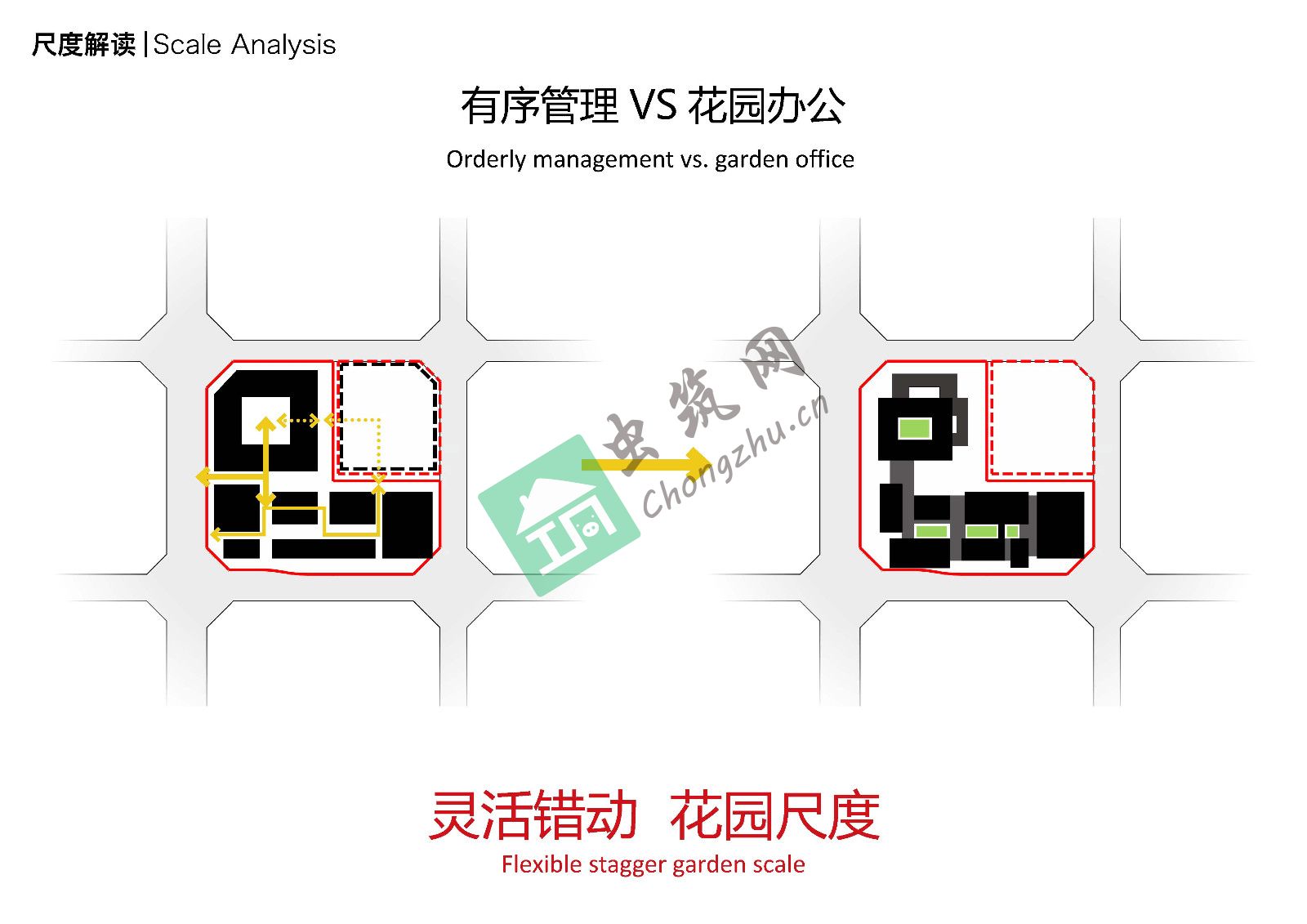 設(shè)計將不利于布局的L型地塊剝離成兩塊矩形用地,并分別嵌入花園庭院,同時又利用空中連廊串聯(lián)兩組建筑。其中完整的回型主樓作為總部整體辦公使用,另一部分辦公被打碎成若干相對獨(dú)立的小型裙房,作為聯(lián)合辦公園區(qū)分別使用,通過設(shè)計手法將聯(lián)合辦公理念延伸到了整個辦公集群。