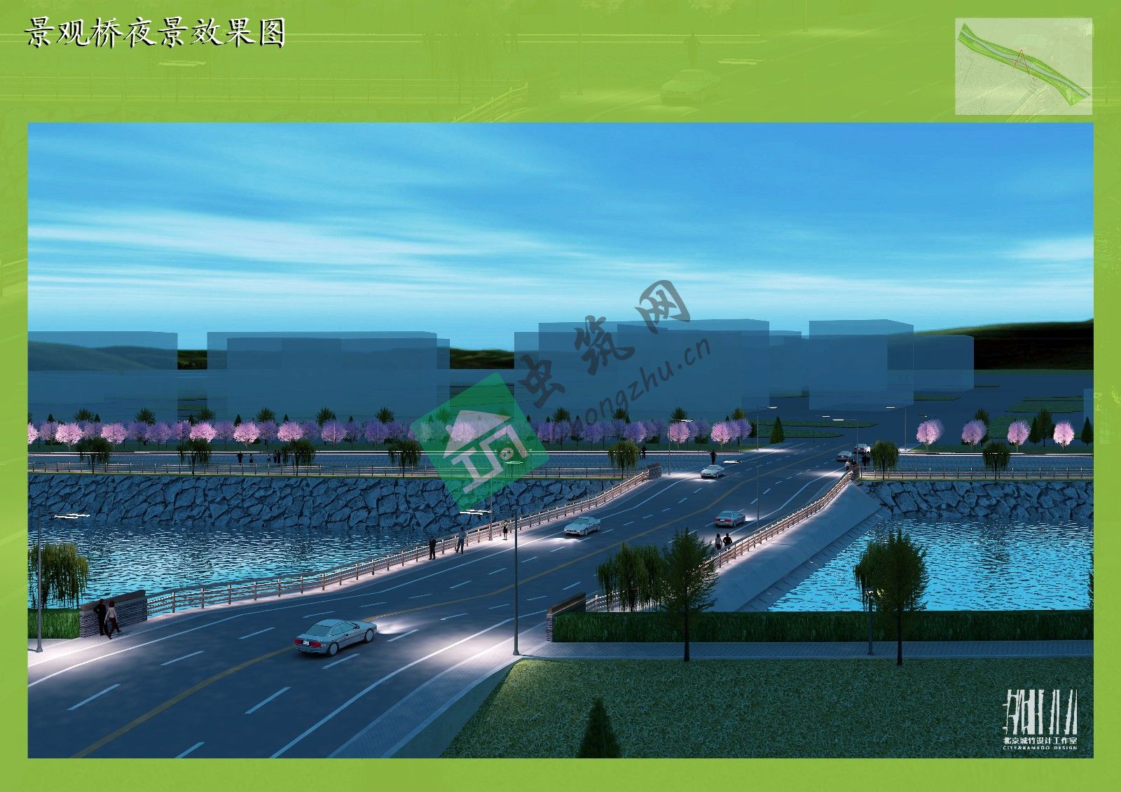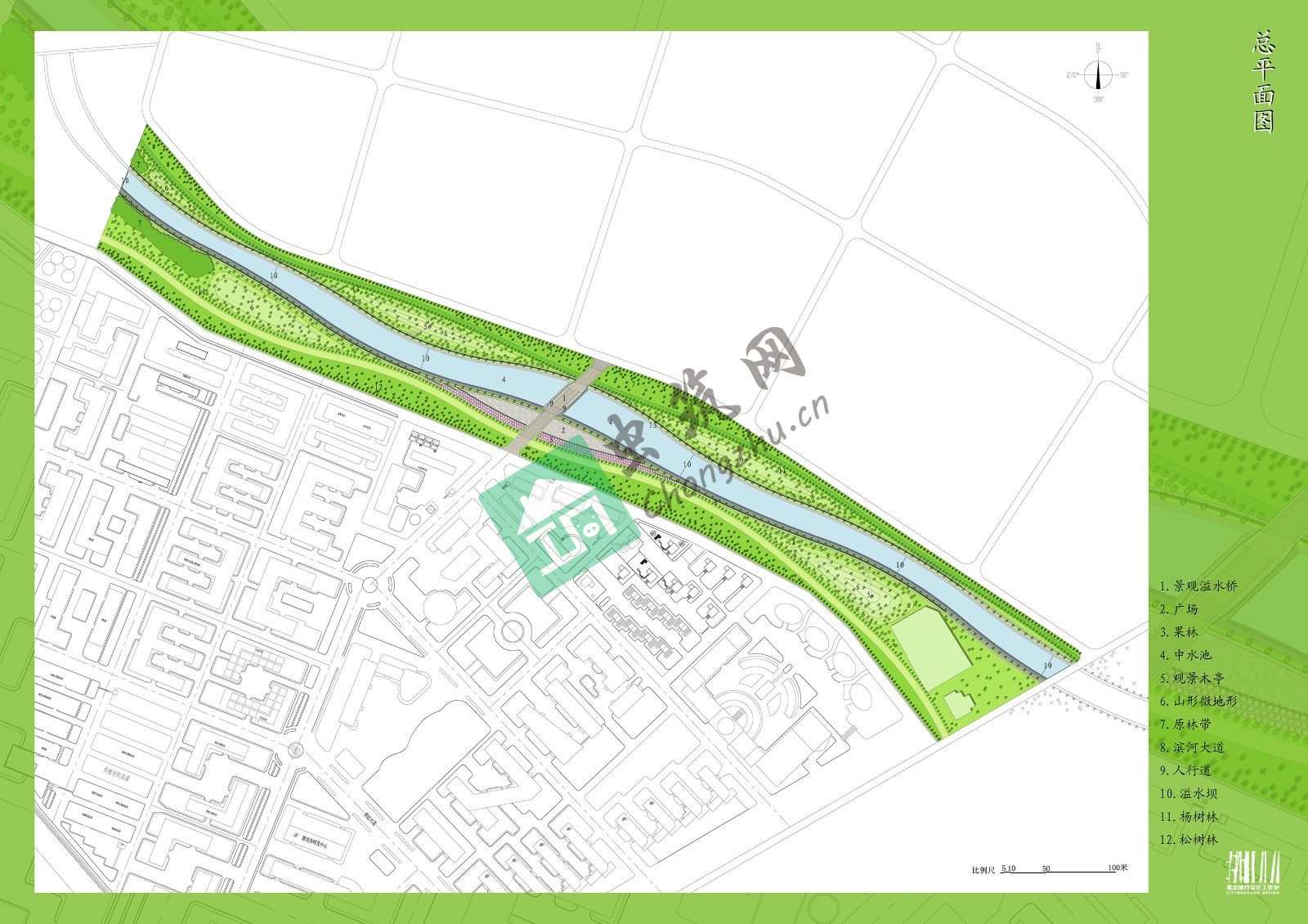 本案利用原有干涸的自然河床改造為中水池,并做景觀美化。原河流駁岸經(jīng)過(guò)休整后置入溢水壩,既解決了百年一遇的泄洪問(wèn)題,又形成了壯觀的跌水景觀;挖出的土方就近堆疊,形成假山,使整個(gè)景觀河的層次更加豐富;中心的廣場(chǎng)進(jìn)一步豐富了景觀層次。