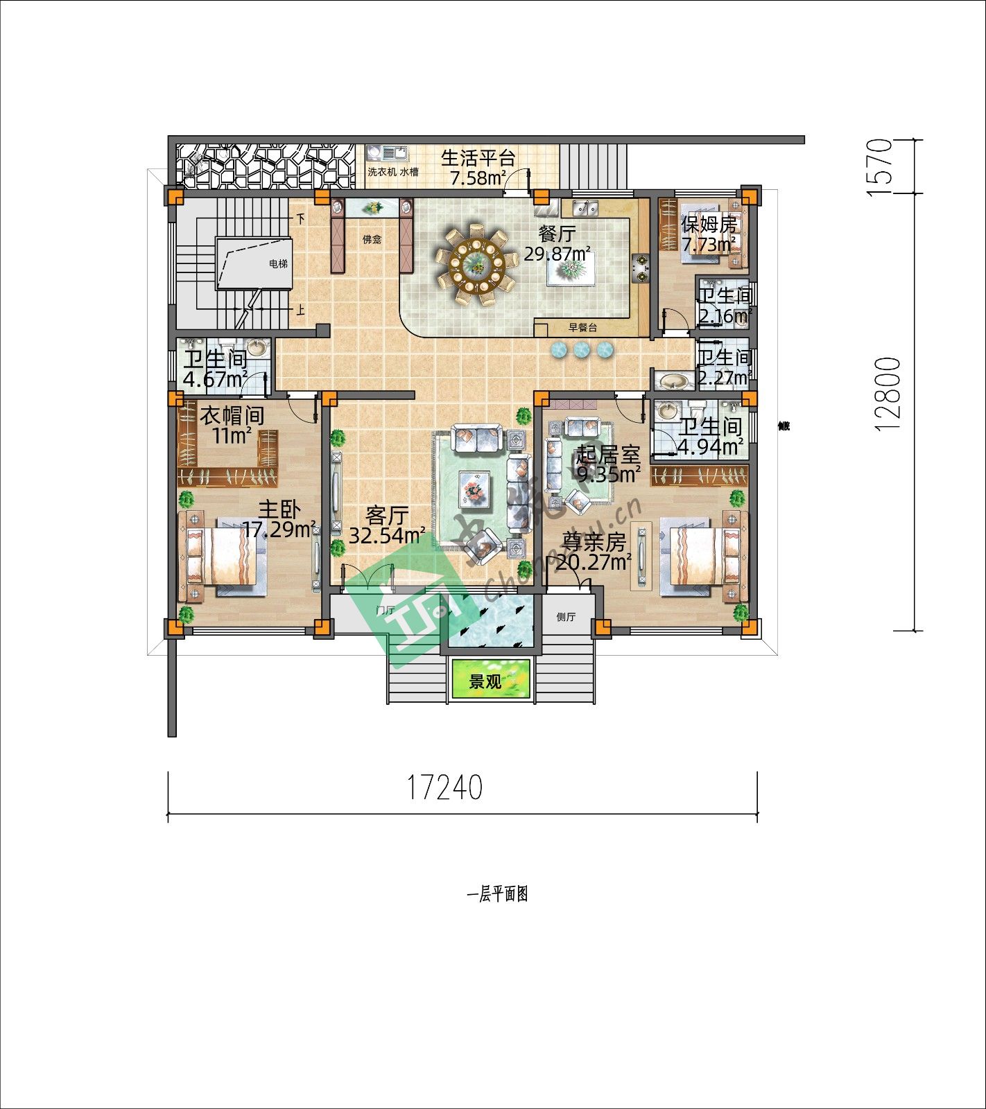 業(yè)主與雙親同住,因此想要偏中式沉穩(wěn)一點的建筑。建筑兩邊階梯上一層,更顯大氣與正式,一邊為正門,一邊是通往老人房,父母進(jìn)出更方便。地下室留有頂層小窗透光,避免太過昏暗,陽光在室內(nèi)空間還是少不了的。二層陽光房與頂層露臺相互搭配,不管是有光透進(jìn)來的封閉空間,還是完全接觸自然空氣的場所,都考慮到了,都是可以讓人體息的地方~?住宅占地很大,空間安排多,室內(nèi)也帶電梯上下樓十分方便。地下室車庫進(jìn)門左邊就是樓梯間與電梯,動線十分方便,除此之外地下室就是一個休閑空間,健身房、影音室、雜物間、酒窖,空間豐富,業(yè)余生活也多~?一層三臥四衛(wèi),預(yù)留了一間保姆房,臥室都帶獨衛(wèi),使用更方便,餐廳在一個空間,開放式更顯寬敞通透,早餐臺更有特色~餐廳連接后門生活平臺,佛龕以置物柜做隔斷形成空間,沉穩(wěn)莊重。二層三臥三衛(wèi),陽光房預(yù)作露臺,光線充足也不擔(dān)心雨天,推開門就是室外露臺,十分愜意。