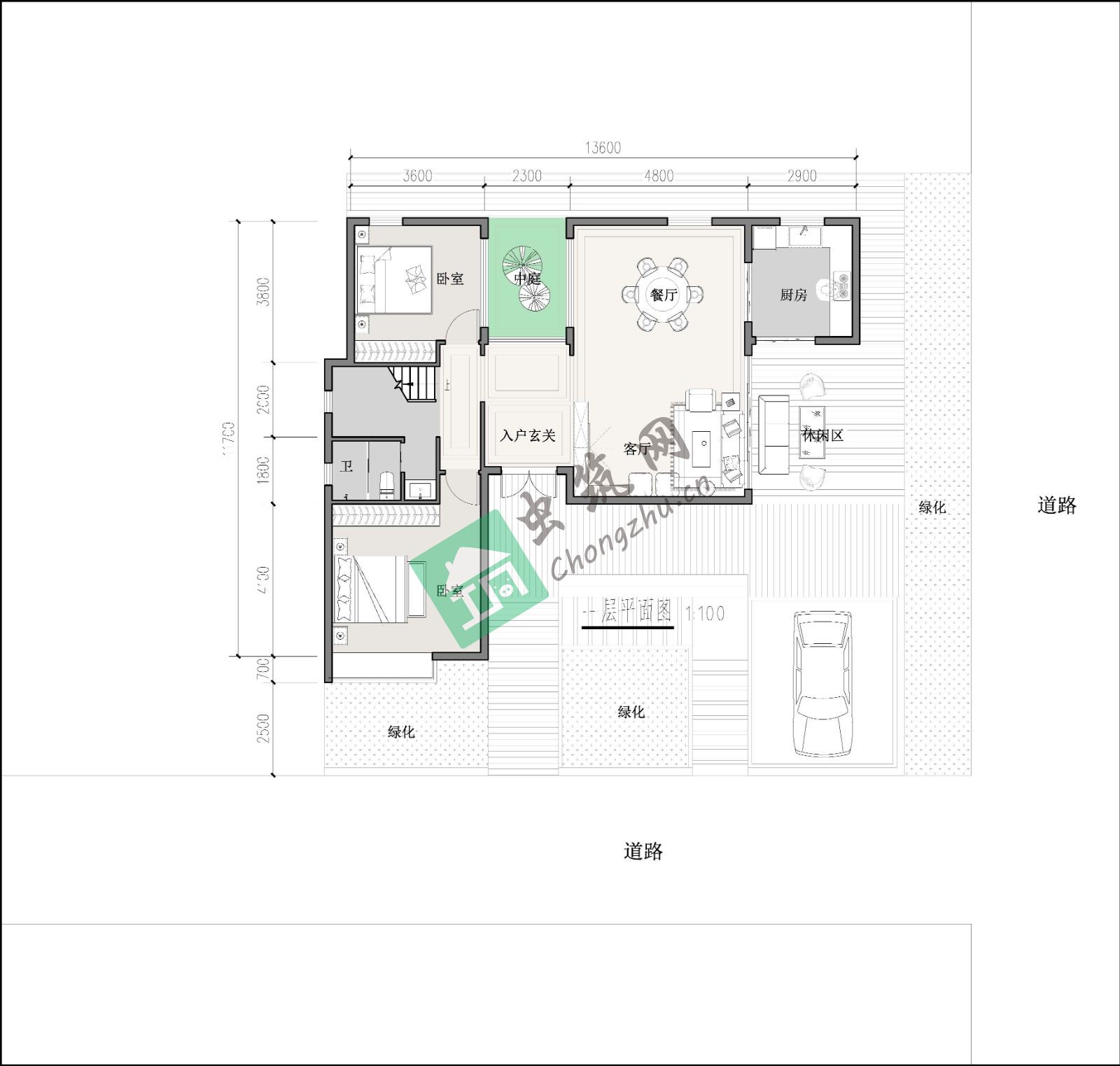 1、臥室布置在基地西側(cè)安靜區(qū)域