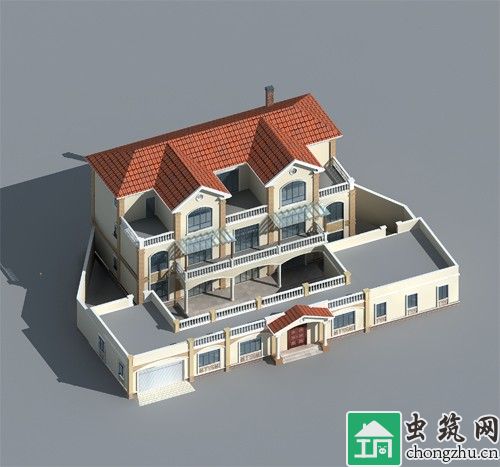 ? ? 正中間的大門將車庫和庫房隔離開來,大門左邊是超大車庫,同時并排放兩輛小車,滿足日常需要。大門后設計成半封閉廊道與外界隔離,方便實用,美觀大方。左右兩邊分別設樓梯上平屋面,方便平時晾曬。主體建筑正中設計為堂屋,堂屋后面為樓梯間,將兩邊分成獨立的兩套戶型,這種共用樓梯的設計,節省了建造成本,擴大了使用面積,一般農村兄弟建房中比較常見。墻角的立柱設計,增強了建筑立體感,二三樓的多露臺設計,建筑更顯錯落有致。